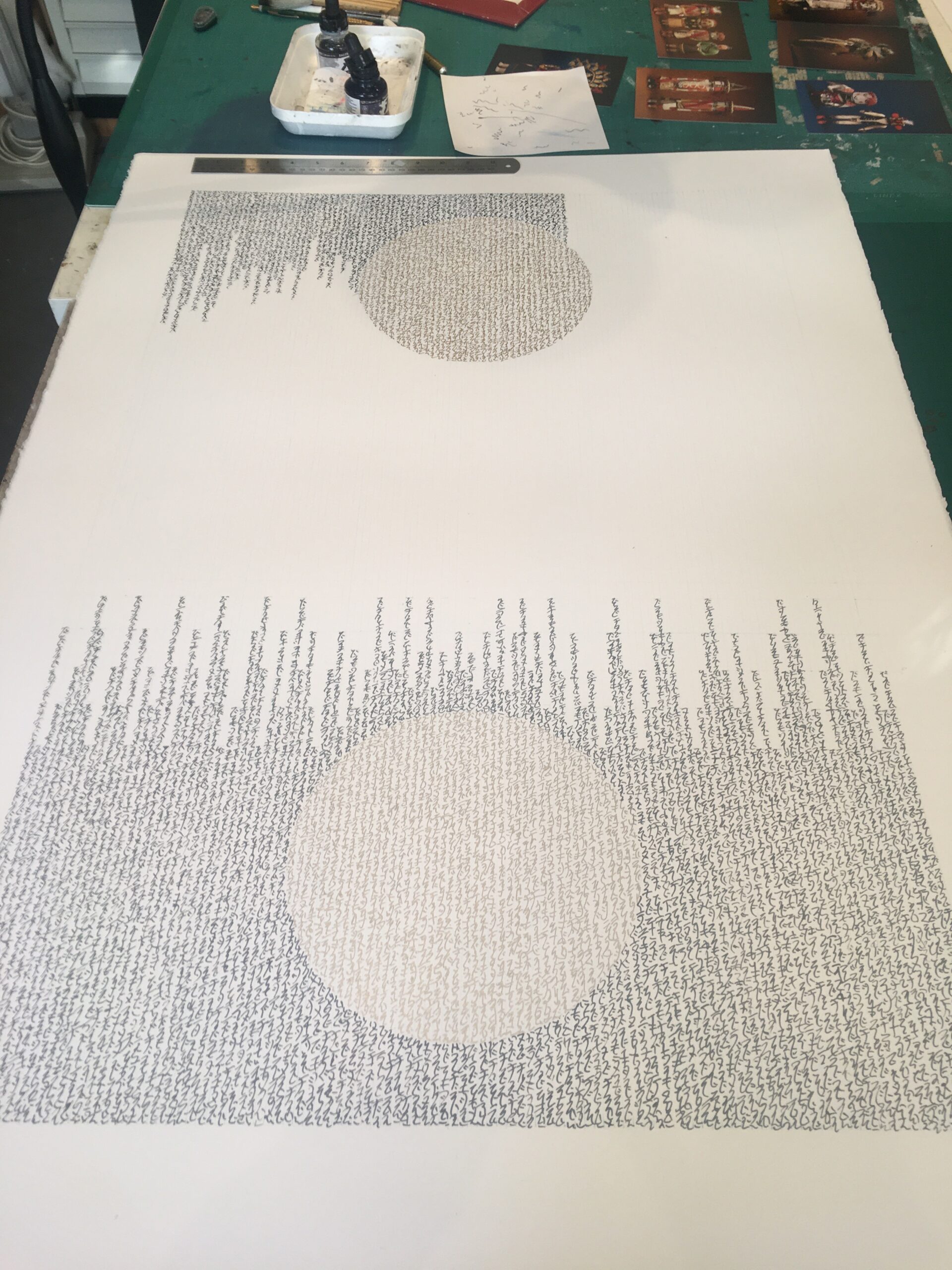 Priscilla draws her inspiration from her personal and professional experiences; travel throughout Asia, Africa and the Americas is reflected in her work, as is the Tarot, Haiku poetry, Asemic writing and the significance of symbol, colour and number in different cultures.